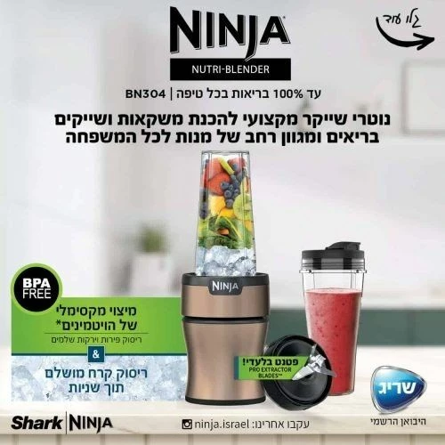להבים : מכלול להבים ייחודי Pro Extractor (פטנט של נינג’ה) עם מבנה ייחודי ובלעדי אשר מרסק את המזון במהירות ויעילות ללא איבוד ערכים תזונתיים. מה בערכה : 2 כוסות TO GO 2 – כוסות בנפח 600 מ"ל מפלסטיק איכותי free BPA , במבנה צר המותאם לרכבים בישראל. הכוסות מגיעות עם מכסי לגימה, כך שניתן לקחת את המשקה לדרך- לאורח חיים בריא גם כשאין זמן. הכוסות ניתנות לשטיפה במדיח כלים.